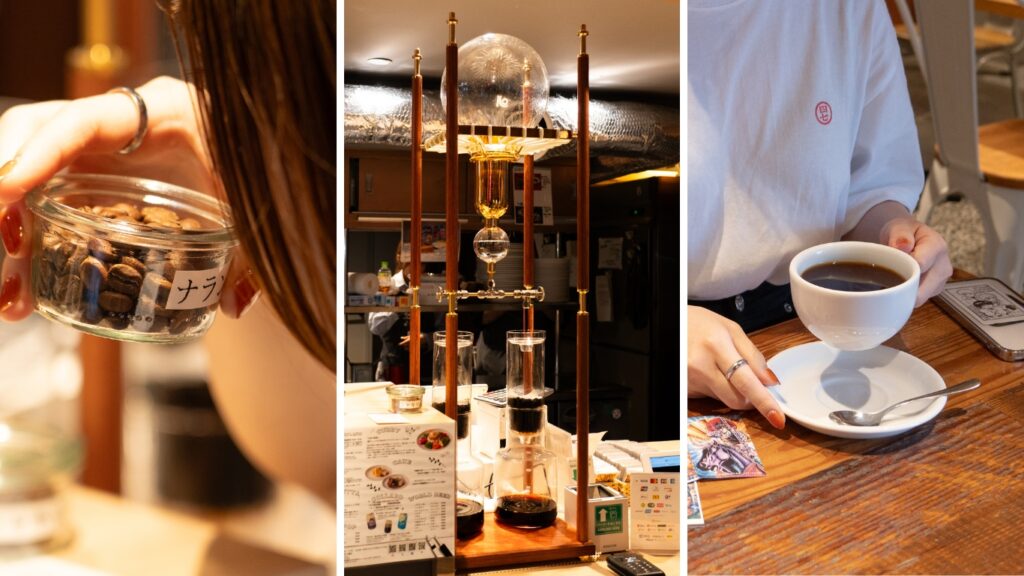 魅力は展示や空間演出にとどまらず、スタッフの萩原さんの『珈琲愛』も凄かった。カフェの珈琲は世界大会で優勝経験を持つバリスタの方に監修をお願いし、豆や抽出方法にこだわった一杯を作っているという。珈琲豆は常時4種から選べるようになっていて、展示期間中はキャラクターをイメージしたブレンド珈琲も展開しているそう。「白川水源」の水を使用したスペシャリティ水出しアイスコーヒーもおすすめだそうだ。